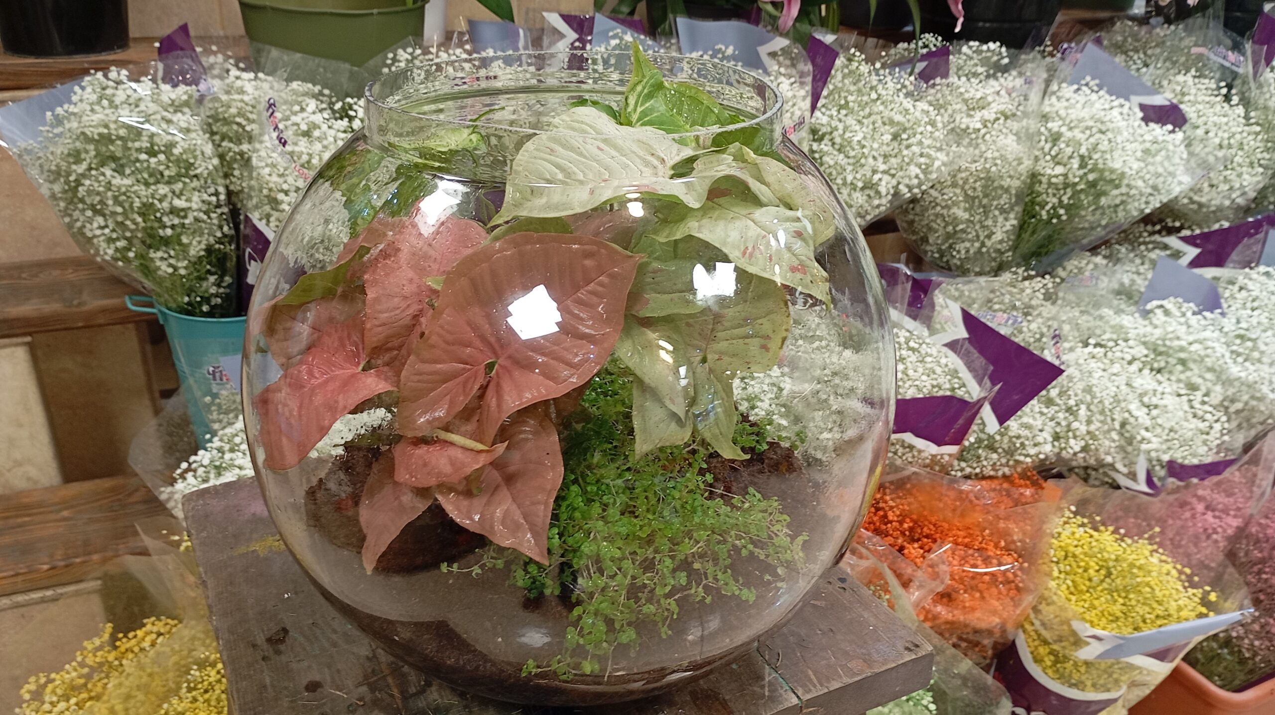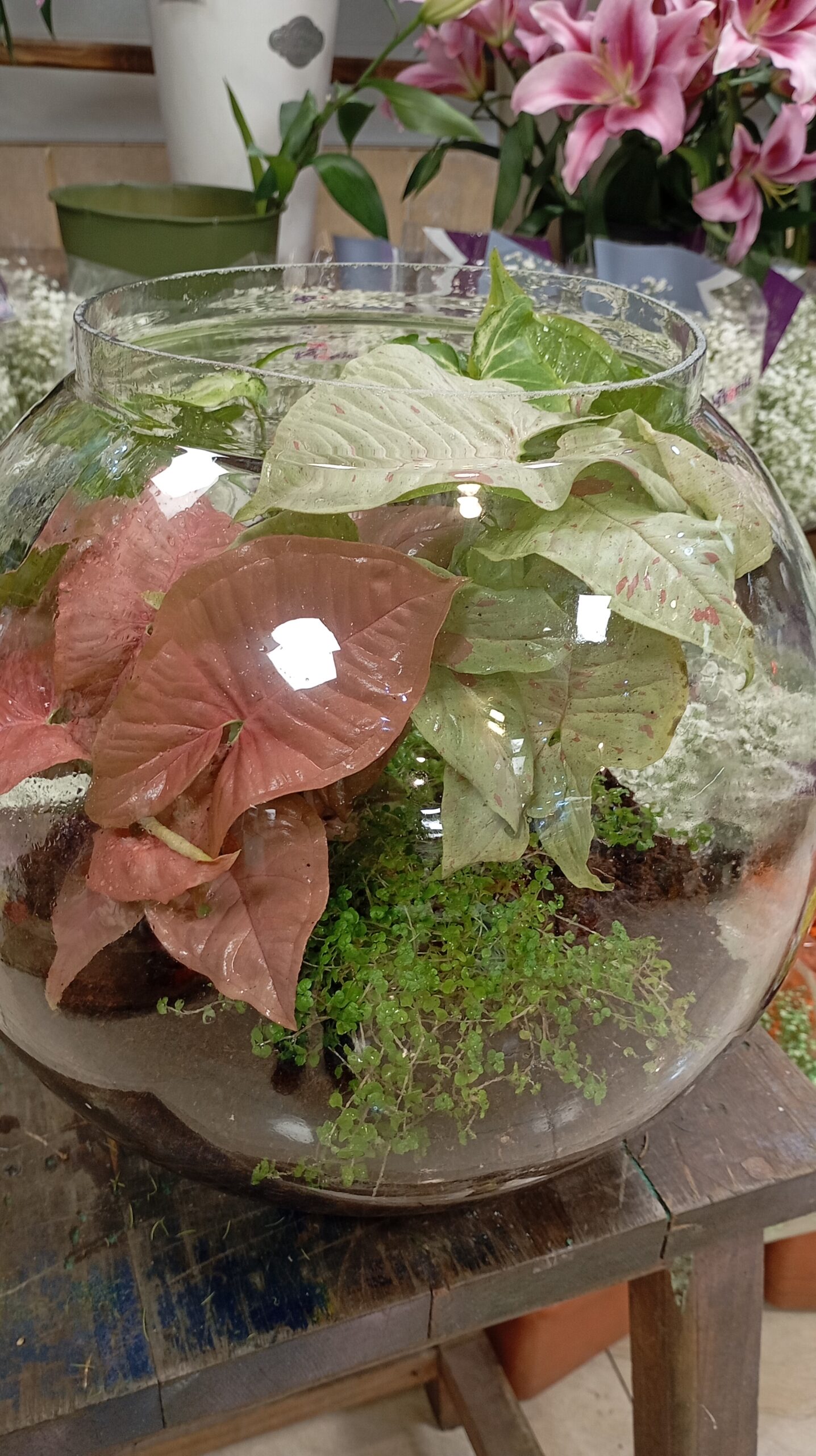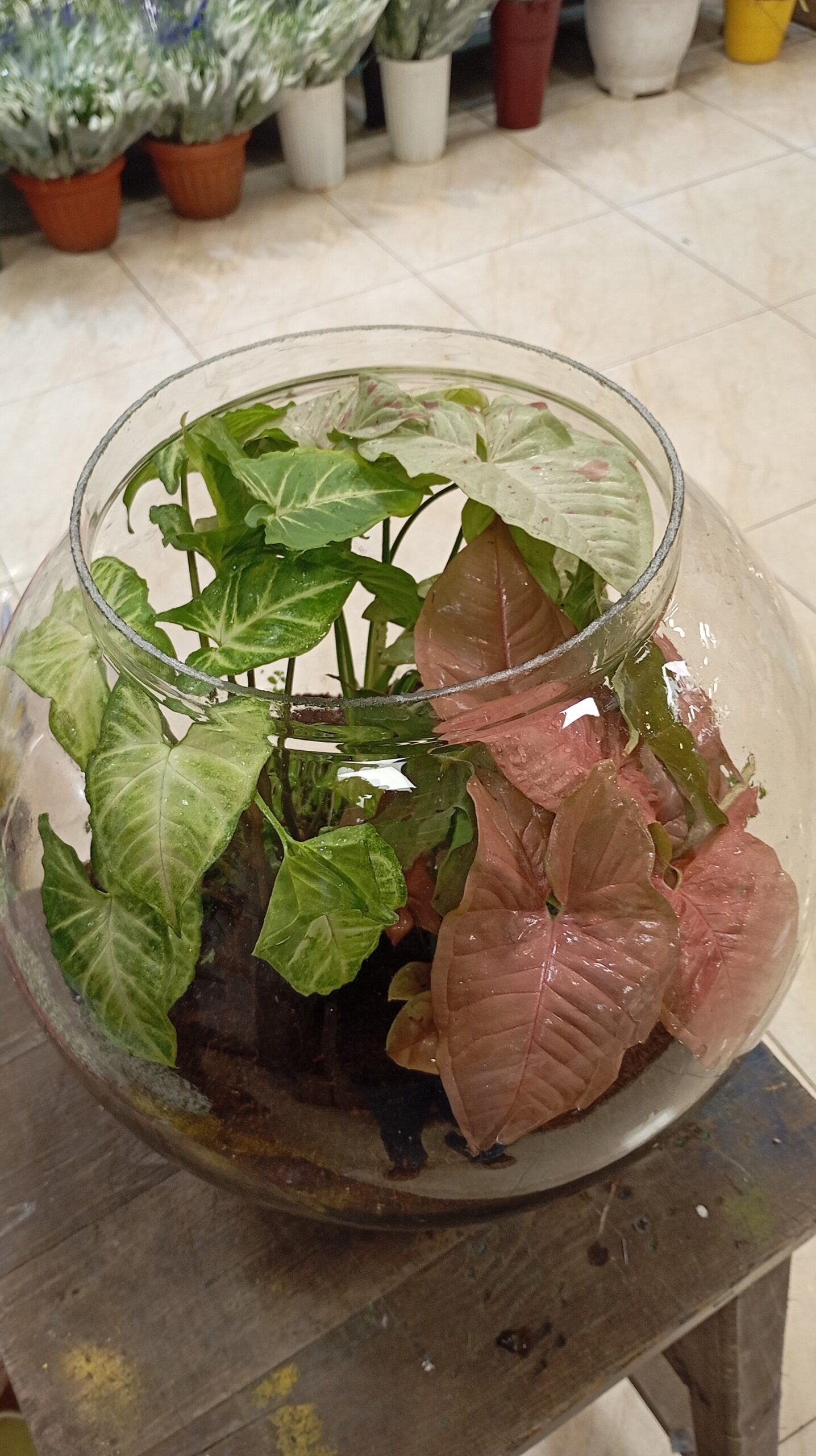 گیاهان بکار رفته در این تراریوم: سیگنیوم صورتی ، سیگنیوم میلک کانفت ، سینگینیوم ابلق ، چمن اشک نوزاد